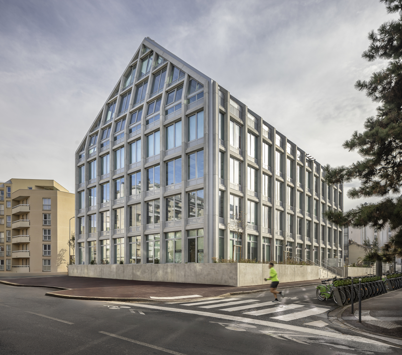 Ce nouveau bâtiment baptisé le Spotlight a été conçu avec un objectif exigeant de sobriété grâce à une collaboration étroite entre la ville, AG Real Estate France et l’agence d’architecture HOFA. Pour y parvenir, un exosquelette en béton fabriqué hors site a été réalisé. Il a par ailleurs permis de réduire les nuisances de chantier pour les riverains et de garantir une qualité de béton qui est reconnue. L’immeuble, avec une capacité d’accueil de 420 utilisateurs offre à son dernier niveau une cathédrale de verre avec une hauteur sous faîtage de 4,5 m et deux terrasses avec des vues exceptionnelles. De plus, le projet Spotlight s’inscrit dans une démarche environnementale ambitieuse, mettant en avant le réemploi de matériaux.