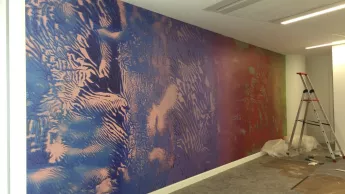 Pour plonger davantage les salariés dans cet univers, une commande spéciale et ambitieuse a été passée auprès de l’école des Arcades : celle d’une fresque, aux paramètres architecturaux et exigences plastiques particuliers, tout en respectant une haute qualité d’exécution. En effet, cette fresque devait d’une part respecter les dimensions de la « Gaming room » (soit 150 m2), mais aussi correspondre à l’état d’esprit ludique et convivial de cette salle, dédiée aux moments de détente du personnel d’Orange.