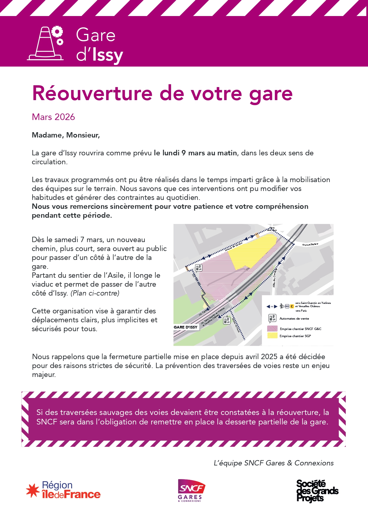 Dès le samedi 7 mars, un nouveau chemin, plus court, sera ouvert au public pour passer d’un côté à l’autre de la gare. Partant du sentier de l’Asile, il longe le viaduc et permet de passer de l’autre côté d’Issy. Cette organisation vise à garantir des déplacements clairs, plus implicites et sécurisés pour tous.