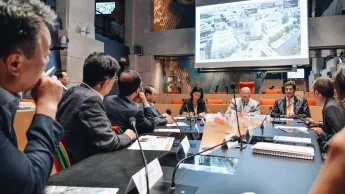 Après avoir découvert les grands projets urbains de la ville d'Issy-les-Moulineaux sur sa maquette numérique et sa stratégie Smart City, la délégation, accueillie par le robot Pepper dans le hall de l'Hôtel de Ville, s'est rendue au Fort d'Issy pour comprendre comment la ville avait mis en place le concentré d'innovations environnementales (géothermie, collecte pneumatique des déchets, constructions d'équipements publics en bois et en paille, autopartage) et numériques (domotique, smart grid, smart mobilité) mis à la disposition des habitants.