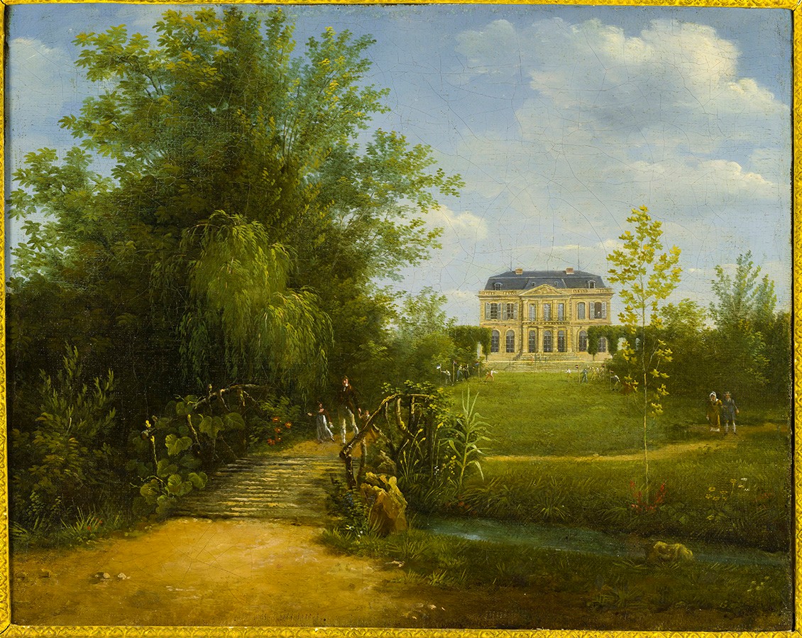 Cette huile sur toile réalisée vers 1830 par un artiste restant à identifier a rejoint les collections du Musée Français de la Carte à Jouer en 2025 après achat auprès de la Galerie Pierre Brost. Ce paysage est une rare vue peinte du château d’Issy lorsqu’il appartenait au Comte de Lespine. Le château d’Issy, dont ne subsistent que de rares traces de son existence, fut conçu d’après les plans de Pierre Bullet (1639-1716). De 1699 à 1777, ce petit château princier demeura la propriété de la lignée des Bourbon-Conti. De 1777 à 1871, le domaine connut plusieurs propriétaires successifs. Les différents acquéreurs apportèrent d’importantes modifications au jardin à la française pour le transformer en jardin à l’anglaise à la mode. En mars 1809, le domaine fut ainsi vendu à Charles-Pierre de Lespine, qui fut Directeur de la Monnaie de Paris. Peu documentée, cette période d’occupation donna très probablement une deuxième vie au château d’Issy. Cette peinture offre une vue intéressante du château d’Issy vu du parc, avant sa destruction, et donne un bel aperçu des modifications et embellissements apportés par la famille de Lespine. L’exécution de cette peinture est typique de l’École Française du XIXe siècle, dans le goût d’Etienne Bouhot.