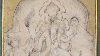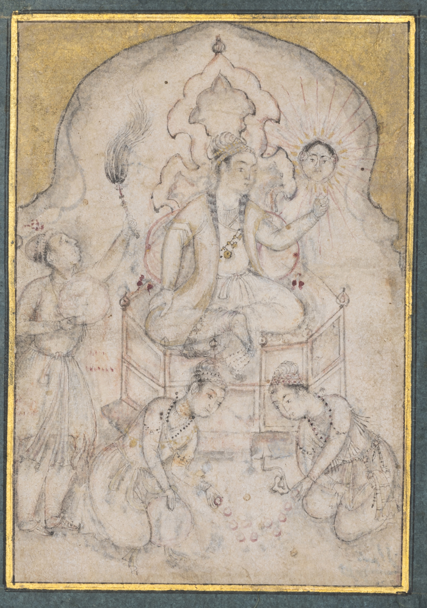 Récemment acquis par le Musée, le dessin d’un « Roi d’Or » issu du jeu de cartes ganjifa moghol, constitue le plus ancien témoignage connu de cartes à jouer dans le sous-continent indien. Il appartenait autrefois à un muraqqa, un album réunissant miniatures et calligraphies prisées des collectionneurs dans le monde islamique. L’œuvre est attribuée à un peintre de l’École d’Ahmadnagar, dans le royaume musulman du Deccan nord-occidental (1490-1636), en Inde, et datée de la fin du XVIᵉsiècle.