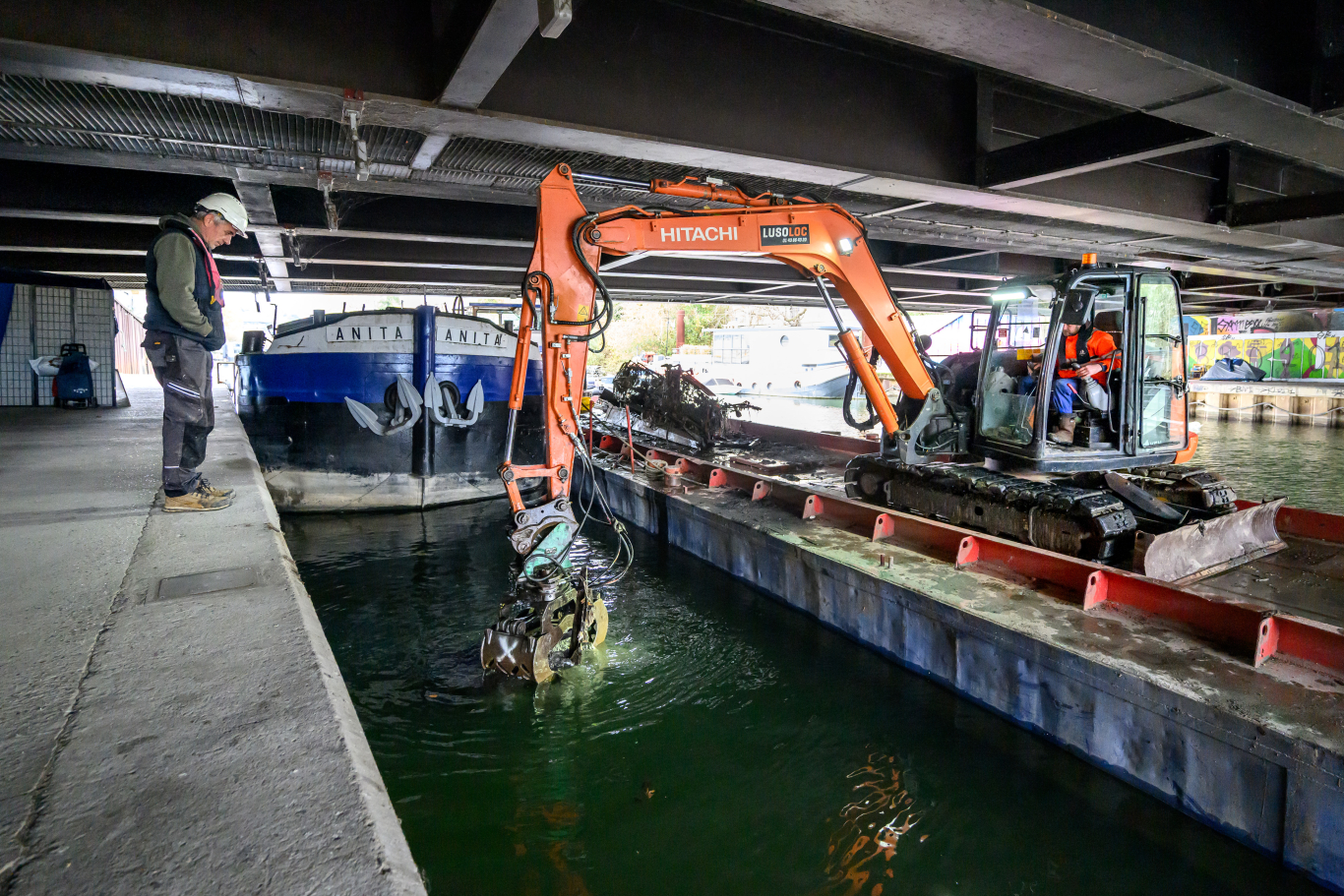 Les travaux ont été réalisés par deux barges mandatées par VNF, les Voies navigables de France, l’une équipée d’une grue, l’autre pour les déchets et financés en grande partie par le Fond pour le progrès humain de la compagnie d’assurance AXA. « Ces épaves sont coulées depuis longtemps, explique Cindy Faria, maître d’œuvre de l’opération pour Travaux Fluviaux, le prestataire chargé du nettoyage. Le bateau-logement NETI NETI était un bateau coulé que l’on ne pouvait pas renflouer parce qu’il était dans un sale état. Il a donc fallu procéder au déchirage du bateau sur place avec la grue. On l’a découpé par petits morceaux et posé les morceaux sur le ponton. »